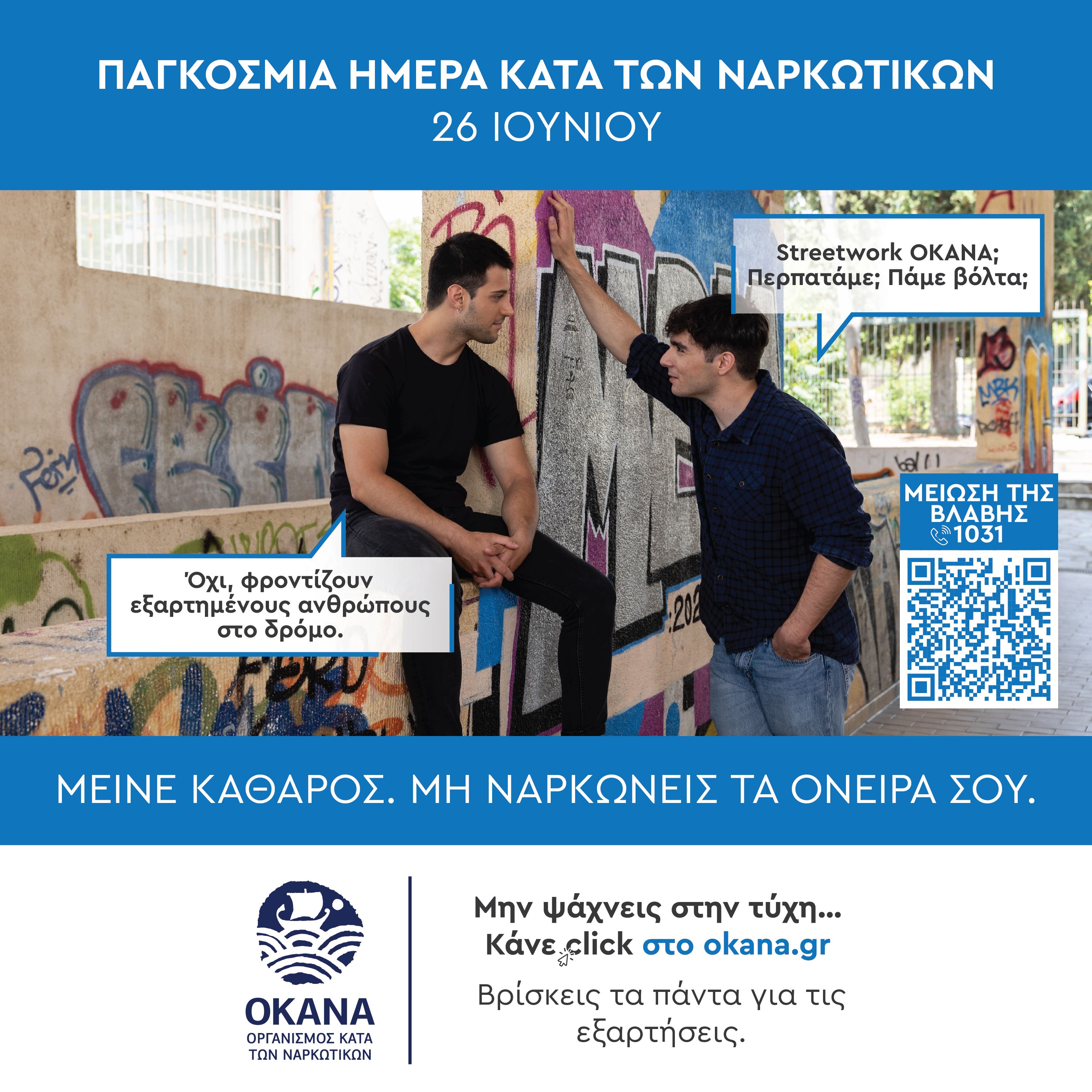 Για την Παγκόσμια Ημέρα Κατά των Ναρκωτικών φέτος, ο ΟΚΑΝΑ επέλεξε το σύνθημα «Μείνε δυνατός. Μείνε καθαρός. Μη ναρκώνεις τα όνειρά σου», αναδεικνύοντας την προσπάθεια των ανθρώπων που καθημερινά έρχονται αντιμέτωποι με το πρόβλημά τους, την εξάρτησή τους. Ο ΟΚΑΝΑ είναι πάντα δίπλα σε αυτούς τους ανθρώπους βοηθώντας τους να επανέλθουν σταδιακά στη ζωή τους, να κάνουν όνειρα και να τα κυνηγήσουν, μακριά από τις εξαρτήσεις, τις εξαρτητικές συμπεριφορές και τον εθισμό. Ο ΟΚΑΝΑ έχει πάντοτε ανοιχτή την πόρτα του, υποδεχόμενος τα εξαρτημένα άτομα με σεβασμό, αποδοχή και φροντίδα σε κάθε εξάρτηση, σε κάθε στάδιο αυτής, χωρίς διακρίσεις.